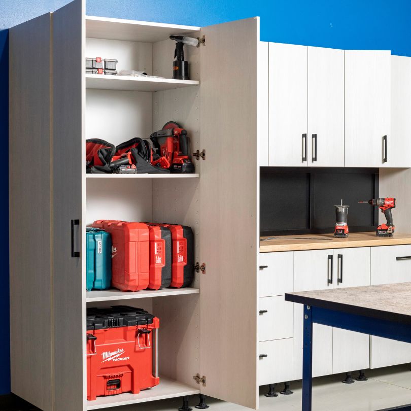 Soft-close doors and drawers keep it tidy. Six cabinet finishes let you match your style. Layouts can include tall units for brooms and ladders, drawers for tools, and a worktop where projects happen.