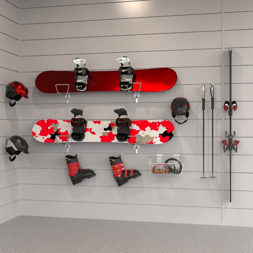- Sport and outdoor: Two tall cabinets for bins and helmets. Slatwall for bikes, kayaks, and paddles. Open space near the garage door for quick load out.